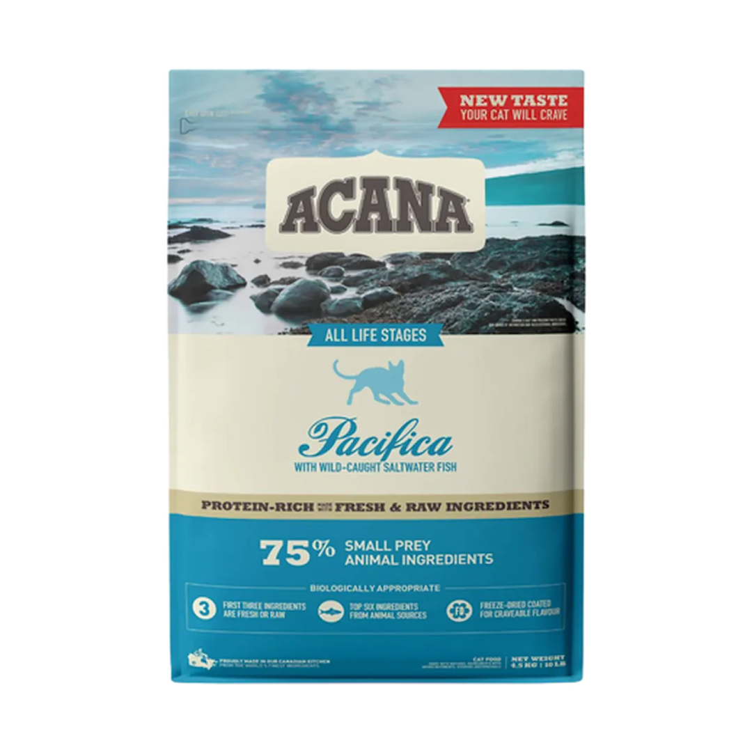 Acana Pacifica Cat Recipe spannmålsfritt torrfoder för katt med sill, makrill, flundra, kummel och kungsfisk för kattungar och vuxna katter. Biologiskt korrekt kattmat av färska ingredienser baserat på kattens naturliga föda av kött, organ/inälvor, brosk och ben (så kallat whole prey) i kombination med grönsaker, örter och bär. Ett torrfoder för att hålla katten och kattungen frisk, stark och nöjd.