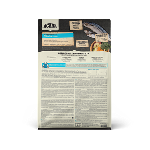 Rå hel sill (14%), rå hel makrill (11%), rå flundra (9%), torkad sill (7%), torkad makrill (7%), torkad blåvitling (7%), hela gröna ärtor, hela röda linser, hela kikärtor,helagrönalinser,fiskolja(6%),råhelkummel(4,5%), rå hel havskatt (4,5%), hela pintobönor, hela gula ärtor, ärtstärkelse, solrosolja, linsfiber, torkad kelp, frystorkad torsk och lever, färsk hel pumpa, färsk hel butternutsquash, färska hela morötter, färska hela äpplen, färska hela päron, färsk hel zucchini, torkad cikoriarot, färsk grönkål, färsk spenat, färska majroveblad, färska rödbetsblad, hela tranbär, hela blåbär, hela saskatoonbär, gurkmeja, mjölktistel, kardborrerot, lavendel, läkemalva, nypon.