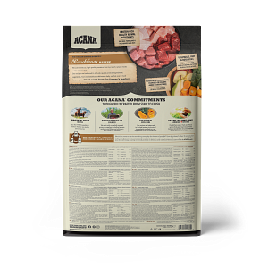 Rått nötkött (9%), rått lamm (8%), rått griskött (8%), torkat nötkött (8%), torkat lamm (8%), torkat griskött (7%), hela gröna ärtor, hela röda linser, hela kikärtor, nötfett (5%), rå nötlever (4%), rå grislever (4%), rå sötvattensfisk* (4%), hela gröna linser, hela pintobönor, hela gula ärtor, ärtstärkelse, rå bison (2%), fiskolja (2%), linsfiber, rå lammlever (0,5%), rå lammage (0,5%), torkad kelp, salt, frystorkat nötkött och lever, färsk hel pumpa, färsk hel butternutsquash, färska hela morötter, färska hela äpplen, färska hela päron, färsk hel zucchini, torkad cikoriarot, färsk grönkål, färsk spenat, färska majroveblad, färska rödbetsblad, hela tranbär, hela blåbär, hela saskatoonbär, gurkmeja, mjölktistel, kardborrerot, lavendel, läkemalva, nypon. *varierad blandning av rå amerikansk siklöja, vitfisk, nordlig gädda och multe