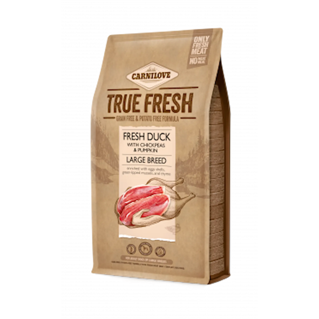 Carnilove Dog True Fresh Duck Large Breed är ett spannmålsfritt torrfoder baserat på färskt anka, särskilt framtaget för vuxna hundar av stora raser. Detta helfoder innehåller en hög andel färskt kött kombinerat med grönsaker, frukter och örter för en balanserad kost. Sammansättningen är anpassad för att möta de näringsmässiga behoven hos större hundar genom naturliga ingredienser.