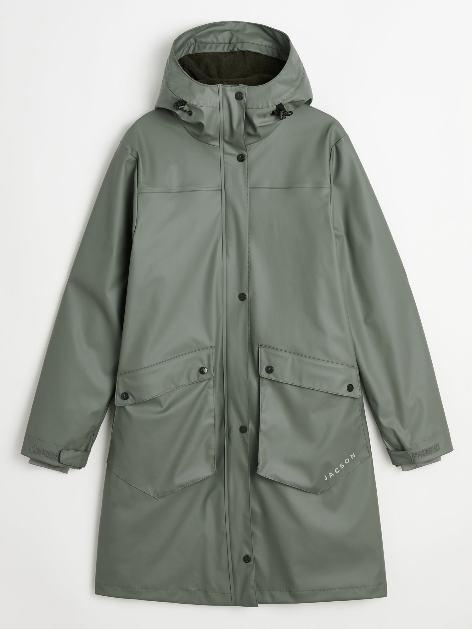 Den här rejäla regnkappan har stora fickor och en justerbar huva. Vår Regnkappa Peggy har länge varit en favorit bland Jacsons kunder, och därför har vi utrustat Barbro med de mest populära detaljerna från Peggy. Den här är fleecefodrad, har svetsade sömmar och lycramuddar i ärmsluten för extra bekvämlighet. Med Barbro fortsätter vi att erbjuda våra kunder högsta kvalitet och skydd mot regnet, samtidigt som de hålls varma och torra.