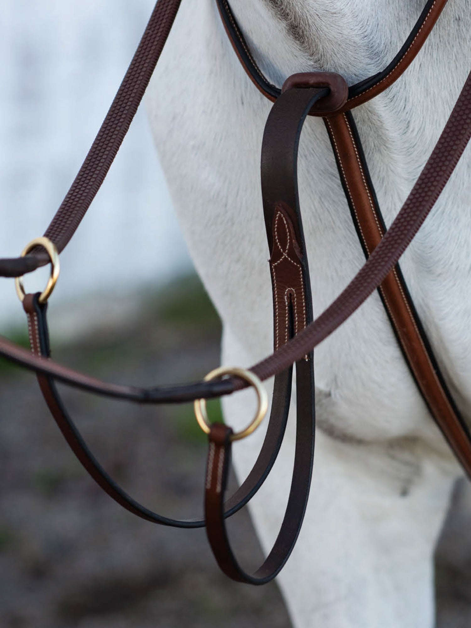 Martingal i mjukt oljat läder. Fästes i sadelgjorden med pistolhake. Ljusa dekorsömmar och spännen i mässing.
