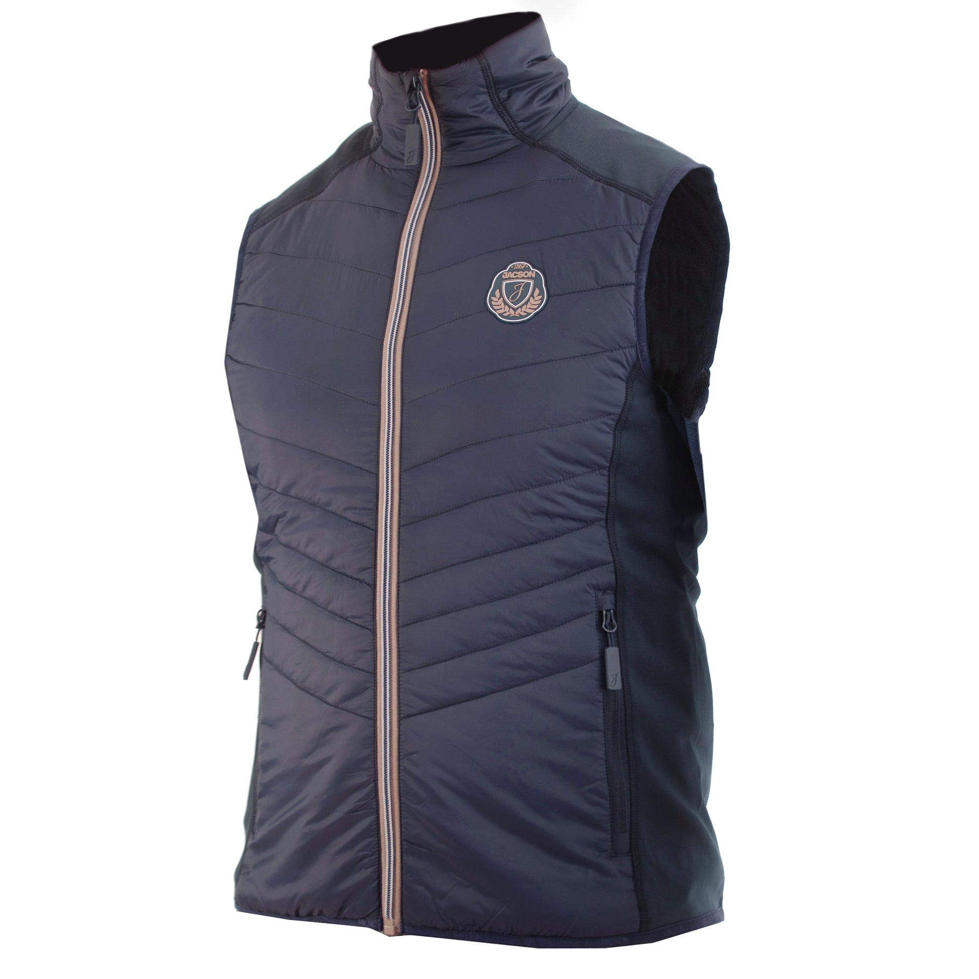 Upplev den perfekta kombinationen av stil och funktionalitet med Jacson Dillon Ridväst. Denna hybridväst är designad i unisexstorlekar och erbjuder en lätt vadderad framsida för extra komfort under ridpasset. Sidopanelerna och bakstycket är tillverkade av en mjuk och stretchig softshell, vilket ger optimal rörelsefrihet och andningsförmåga.