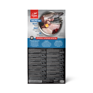 Färsk kyckling (25 %), rå kalkon (8 %), färska kycklinginälvor (lever, hjärta) (7 %), rå hel sill (6 %), rå hel kummel (5 %), färska ägg (5 %), rå kalkonlever (5 %), torkat kycklingkött (4 %), torkat kalkonkött (4 %), torkad makrill (4 %), torkade sardiner (4 %), torkad sill (4 %), hela röda linser, hela kikärtor, hela ärtor, kycklingfett (3 %), hela gröna linser, hela pintobönor, hela marinbönor, lins ber, pollockolja (1 %), ärtstärkelse, torkad kelp, färsk hel pumpa, färsk hel butternutsquash, färsk hel zucchini, färska hela morötter, färska hela äpplen, färska hela päron, torkad cikoriarot, färsk grönkål, färsk spenat, färska rödbetsblad, färska majroveblad, hela tranbär, hela blåbär, hela saskatoonbär, gurkmeja, mjölktistel, kardborrerot, lavendel, läkemalva, nypon.